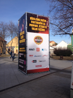 Nepřehlédnutelný reklamní totem, který lze využít na více místech během roku a na němž můžete měnit grafiku a tisky dle potřeby. Pevná ocelová konstrukce s žárovým zinkování nebo odolným nátěrem. Uchycení PVC banneru je pomocí gumových lan a kotvení dle terénu do země nebo pomocí betonovou zátěží.