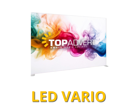 VARIO - lehká a modulární LED prezentační stěna s PVC rámem, ideální pro výstavy a promo akce. Lze ji použít samostatně nebo kombinovat do sestav výstavních stánků. Balení je možné v tašce nebo v kufru.