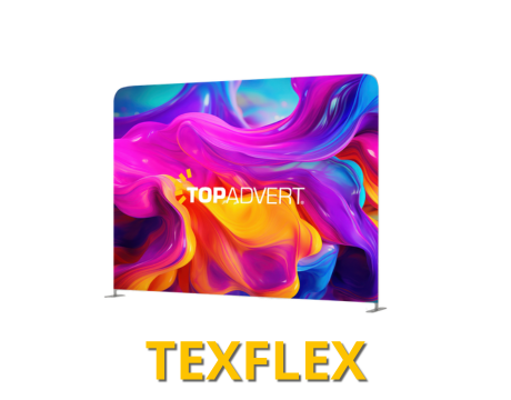 TEXFLEX - nesvětelný trubkový rám s textilním tiskem ve dvou tvarech – rovný a oblý – dostupný v různých velikostech pro flexibilní prezentační řešení. Dodáván včetně transportní tašky.